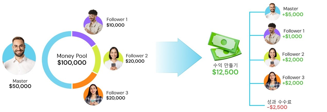 팔로워들은 성공적인 거래로부터 수익의 일부를 받으며, 마스터들도 수익률 수수료를 받습니다.